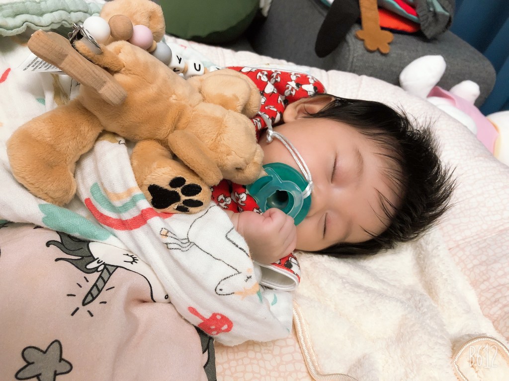 在訓練睡過夜的時候,流程、環境、燈光都會影響,YUI的睡前SOP是洗澡→喝奶(同時只開夜燈,讓房間很暗)→喝完睡覺,睡前會多增加30~60 ml的奶量。如果喝完還是不想睡,就會先讓她玩一玩,覺得她快想睡的時候再補一點奶,通常就會很快睡著了。