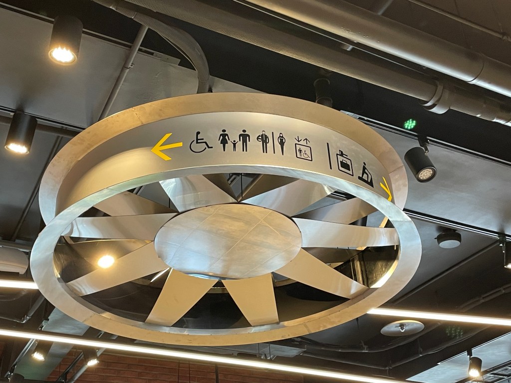 抬頭看也有廁所、電梯、行李櫃、健身房的指示。我覺得廁所的標示圖超可愛的!!男生的是抱著籃球的圖案。