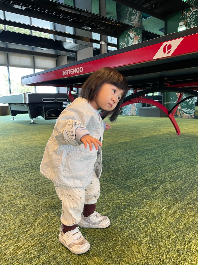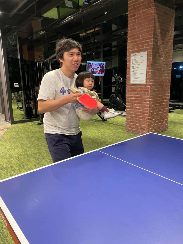 然後回來就來跟朋友打桌球,小孩表示也想參與,只好抱著打XD