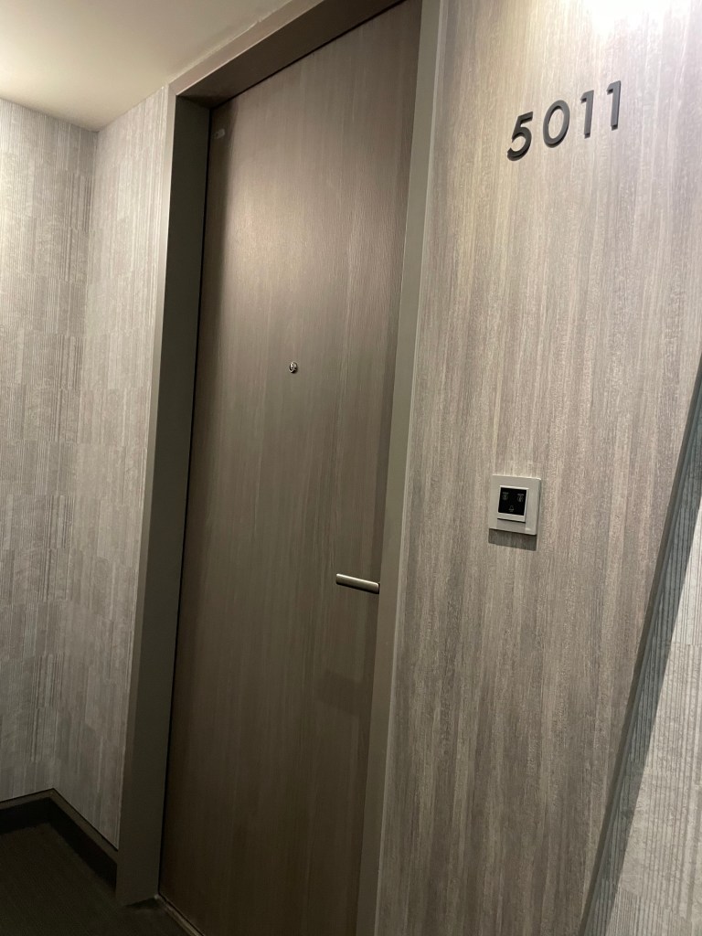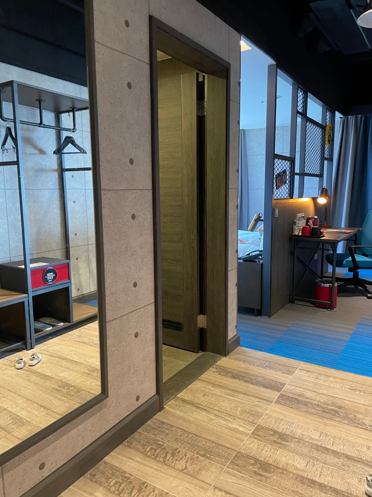 進門的右手邊有掛衣服的地方、也有紙拖鞋和保險箱。(但我覺得如果家有一歲的小孩,這個保險箱的擺放位置就會讓人很困擾,因為小孩會手賤一直去按…….媽媽本人超害怕保險箱會被按壞掉,一直把小孩從這裡移去別的地方QQ)
