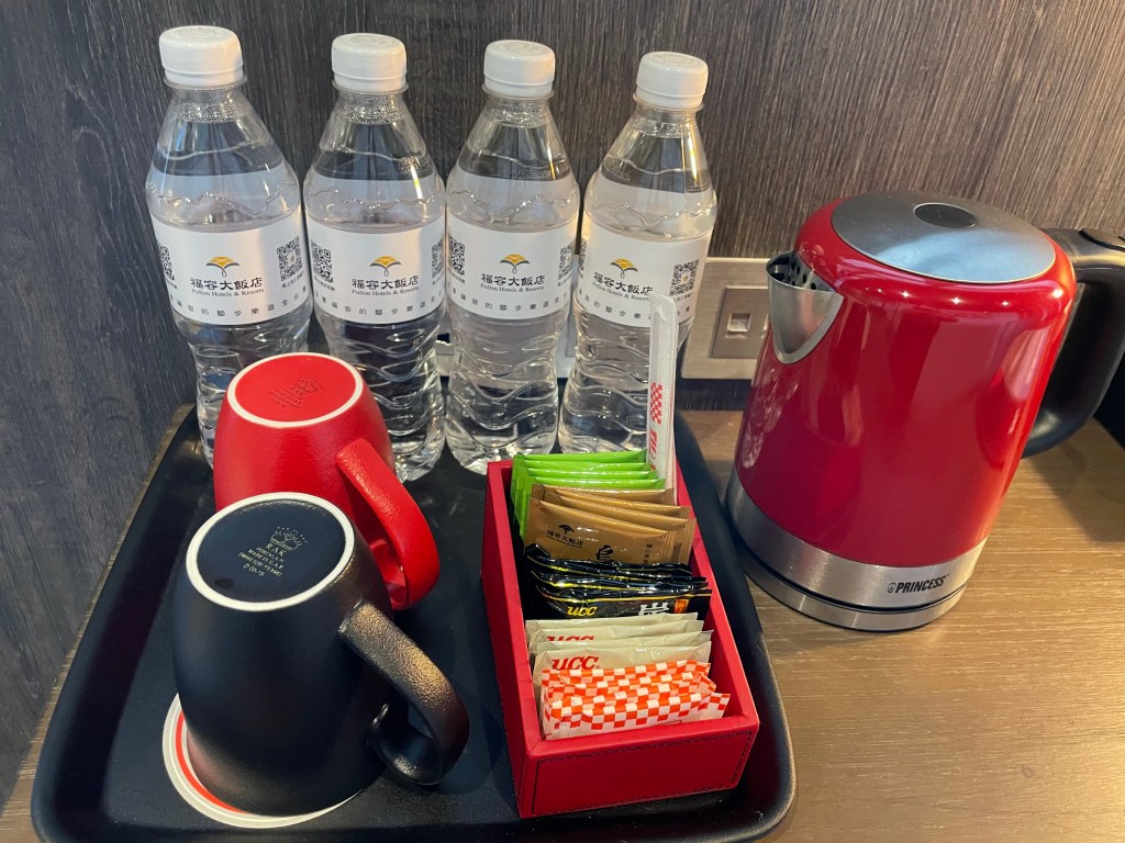 房間內給我們四瓶水覺得有點貼心,熱水壺煮水很快速,整個配色也是有主題性的。