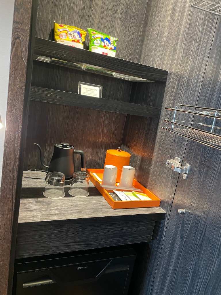 旁邊的櫃子打開有贈送兩包乖乖和茶包。房間提供百慕達的手沖水壺。下面冰箱的MINI BAR也是任你飲用。橘色的是冰桶。