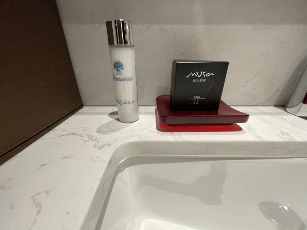 一旁有飯店的香皂與義大利Allegrini的身體乳液。