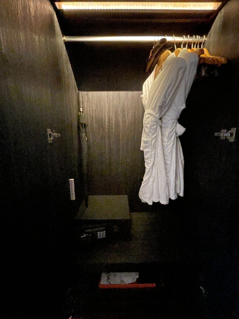 櫃子裡有提供浴袍、雨傘,下方有保險箱和拖鞋。