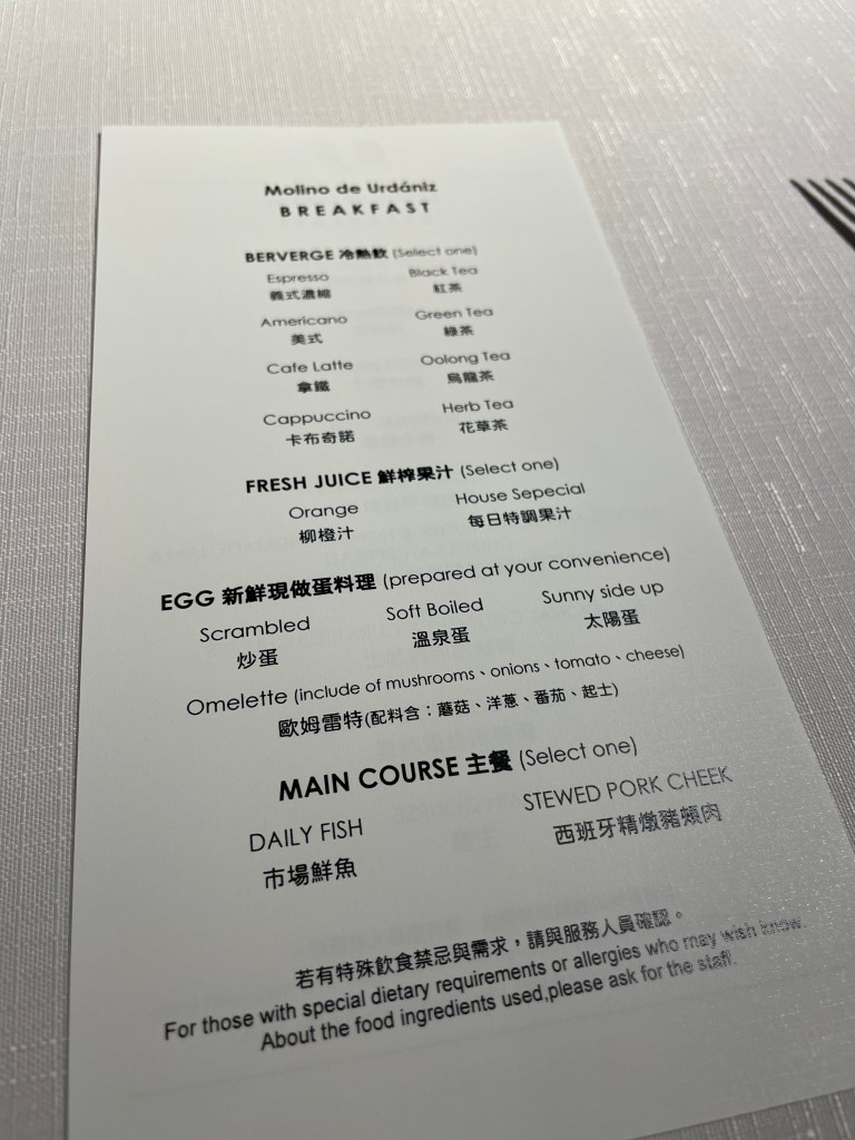 早餐菜單,現場再選飲品和果汁。還有送一杯餐前白酒。