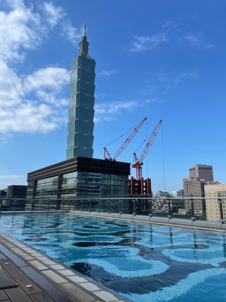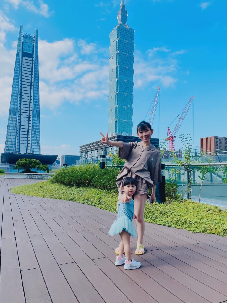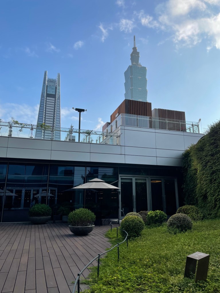 不得不說中庭的View也蠻好的,很安靜,遠方可以看到101。中庭上方木頭的建築物,那邊就是飯店的游泳池了。
