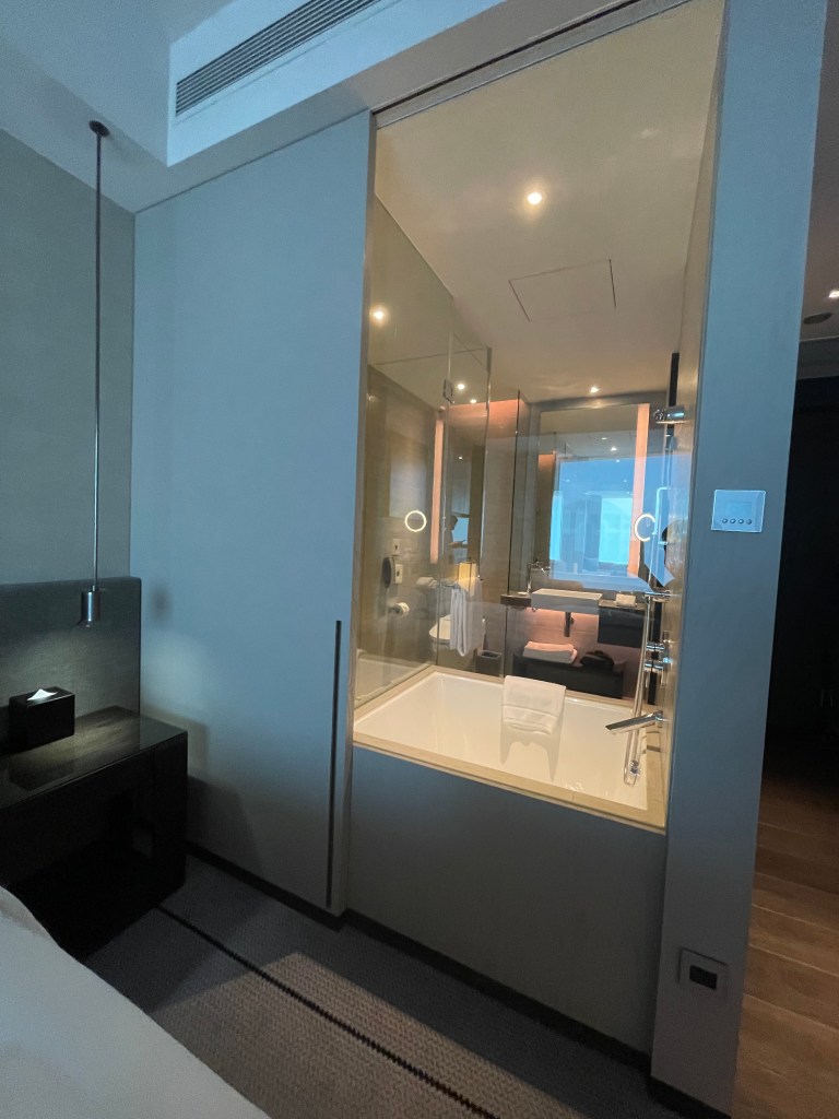 床的旁邊就是浴室,跟慕舍酒店一樣是浴缸靠近床,只是艾麗的有多一層玻璃隔開。如果洗澡不想被看到的話,床旁有拉門可以拉起來。