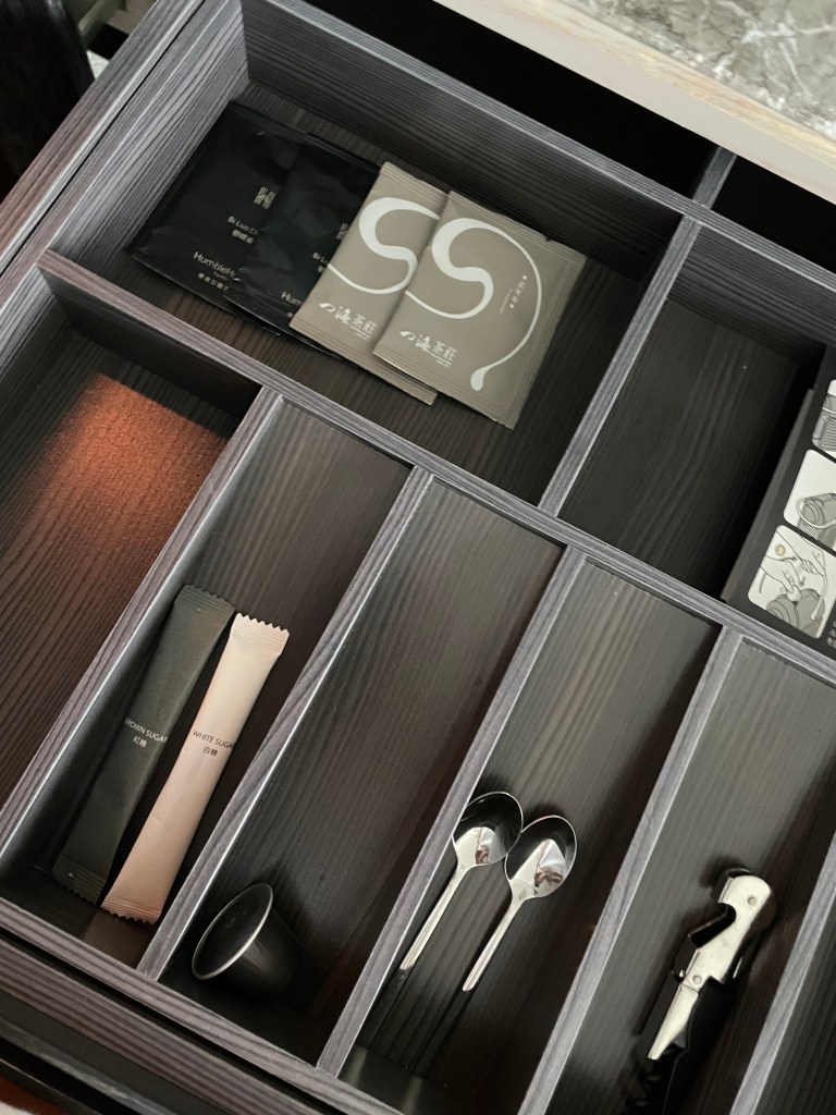 下方抽屜有茶包和備品,再下面是鏡面的冰箱,裡面什麼都沒有。