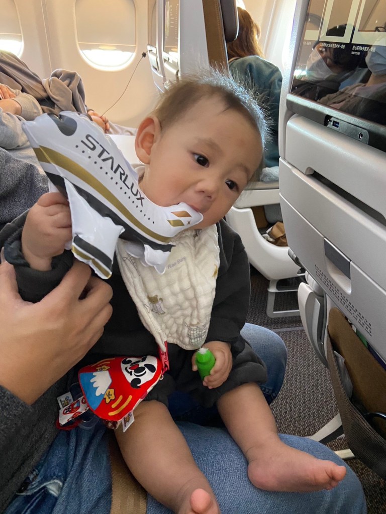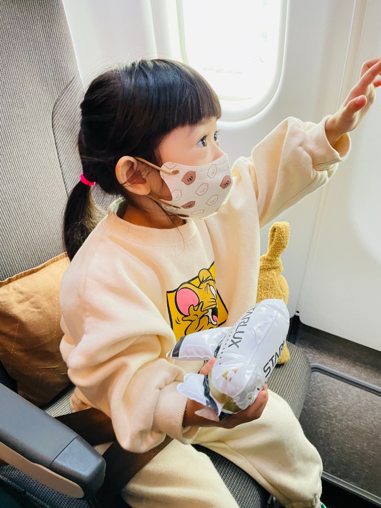 帶了小孩的毯子,一上飛機空姐就先給玩具,一路觀察什麼時候要起飛,要把奶泡好,準備餅乾和水給小孩吃。