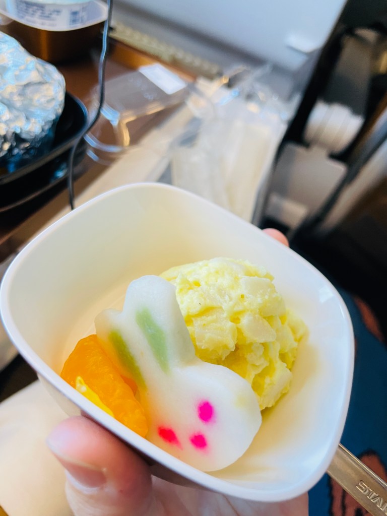 大人的餐在一陣兵荒馬亂中被我完食,那時候一邊抱著弟弟一邊吃飯,然後當空姐給我一杯水後,迅速被弟弟的手灑掉,總之沒拍到大人的食物,去程我點了一個海鮮粥,白白的粥上面有一些看起來乾乾的高麗菜,本來想說這也太清淡,沒想到還算ok,稀哩呼嚕一下就吃完了。