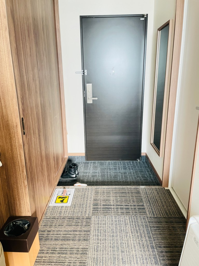 一進門有個類似玄關的地方,也有全身鏡,上來有規定要脫鞋。左邊衣櫃,右邊廁所。