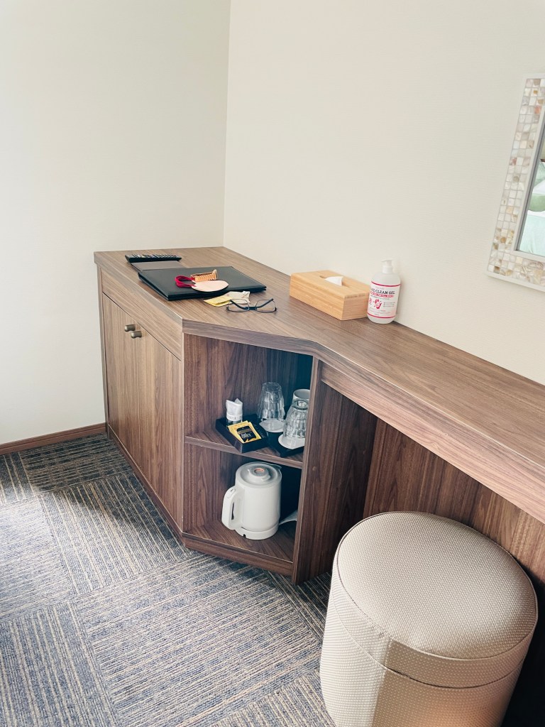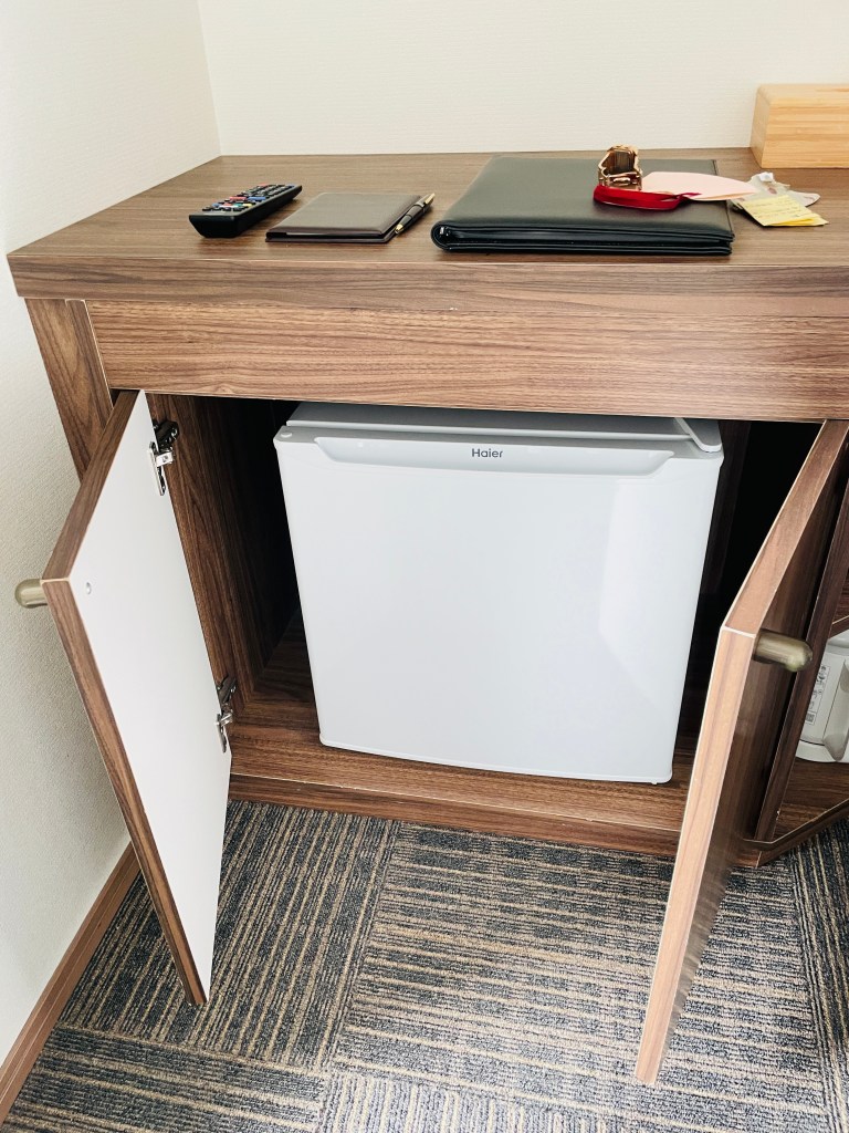 梳妝台過去就是有茶包、茶杯和熱水壺,一旁櫃子裡也有冰箱。