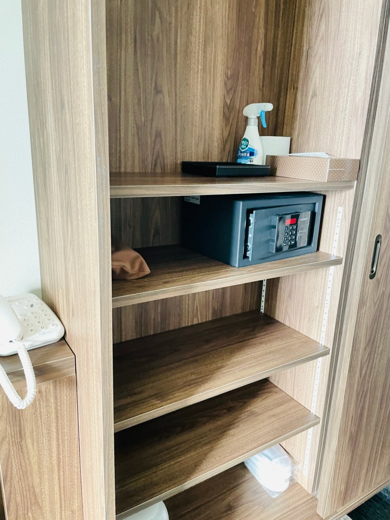 衣櫃裡有除臭噴霧、衛生紙、國際牌很好用的吹風機、保險箱和拖鞋。