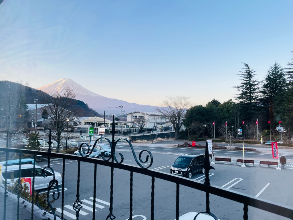 打開窗戶看到的景象。這次入住的房間是邊間,看到富士山的角度不是太好,不過還是看得到。