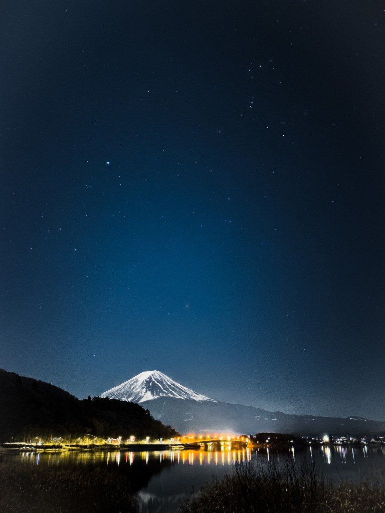 半夜另一半跑去湖邊夜拍。晚上的富士山搭配湖景,真是有夠漂亮。