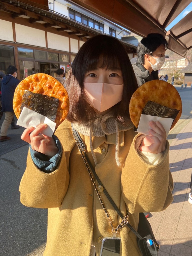 一旁也是有一些小吃可以買,我們在這裡買了仙貝吃。其他熟食很多都要排隊,好險剛剛有先在里根場吃了一點東西。