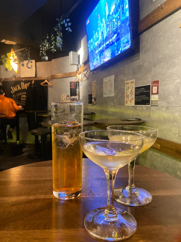 這間在地下一樓,當晚大概11 點多進場,人~超少~大概就3桌的人。裡面是掃QR CODE點餐,每一杯酒都超~便宜~大概就是300多日幣,餐點也是。點完餐之後收到金額簡訊嚇一跳,真的有夠便宜。