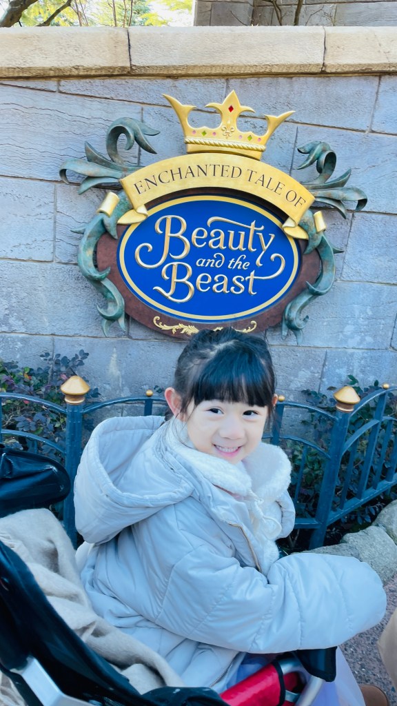 我們入場買完該買的DPA和借完推車之後,一路上就先直衝美女與野獸,這個我們沒有買DPA,抵達時後發現已經人潮不少,工作人員舉著牌子說要等50分鐘,我們就趕快跟上隊伍,不過前進的蠻快的,所以體感上覺得好像沒有50分鐘那麼久。