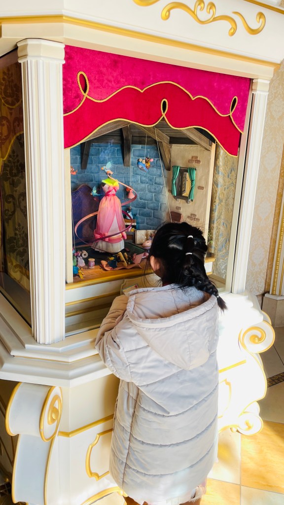 小孩看著仙杜瑞拉裡面小鳥幫忙做禮服的裝置看了好久。這會動喔~超可愛的。
