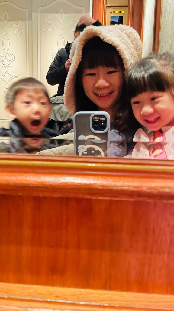 城堡有兩種下樓方式,推推車的話可以搭電梯下樓,走路可以走城堡外面的樓梯下樓,其實我好想走城堡外面,可惜要跟小孩一起走。剛好電梯沒人,跟小孩自拍。