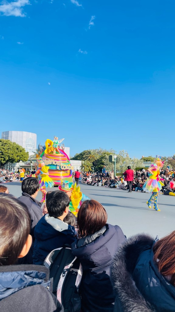 休息完後我們就準備去看遊行了。下午2點的遊行。因為我們有買DPA,所以不用早早去搶座位。但後來我發現其實買DPA看遊行的人沒有很多,我們坐在DPA的第二排,但後面也都沒有人坐了。如果買假期套票的話,那個位置在DPA的再後面一區,課金坐位真的不錯。