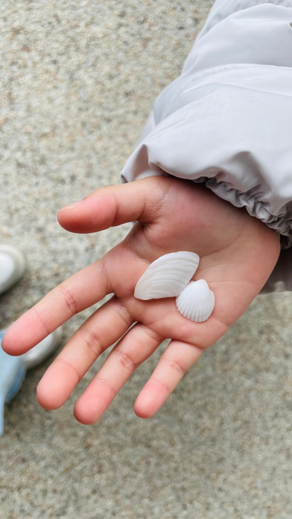 小孩在沙灘上撿到了一些漂亮的貝殼。