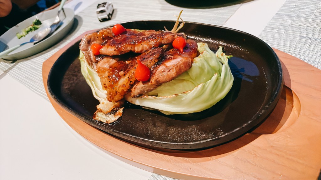 鐵板肉排,不得不說底下的菜也很甜很好吃,上面肉排黑胡椒很足,肉體紮實,但有些地方蠻肥的,端上來很香,但吃起來比較不好咬一點,牙口不好的人不適合點。