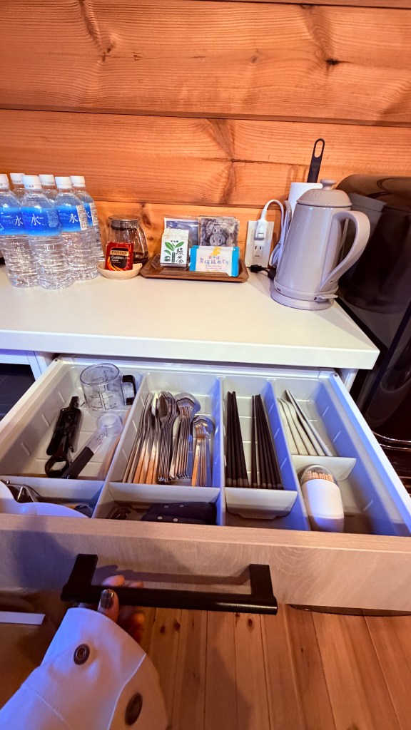 廚房後面就是冰箱和廚房用品。這裡什麼都有,什麼都不缺。水、茶包、咖啡包給的超多。