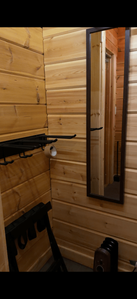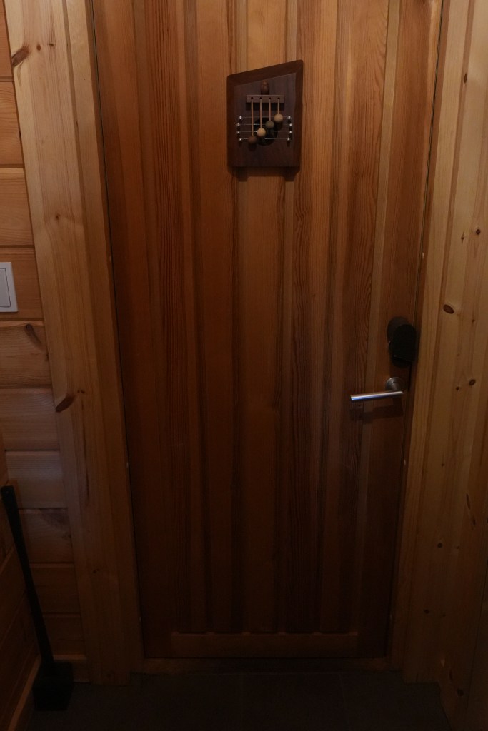 玄關與房子內部還有一扇門,防止暖氣流出。兩側都有掛鉤可以掛衣服,也提供室內拖。
