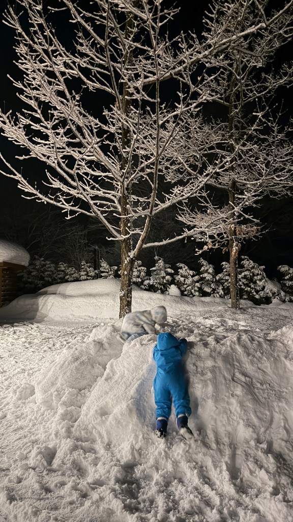 吃完晚餐外面的雪變小了,小孩跑去花圃上玩雪玩瘋,在雪上溜上溜下。
